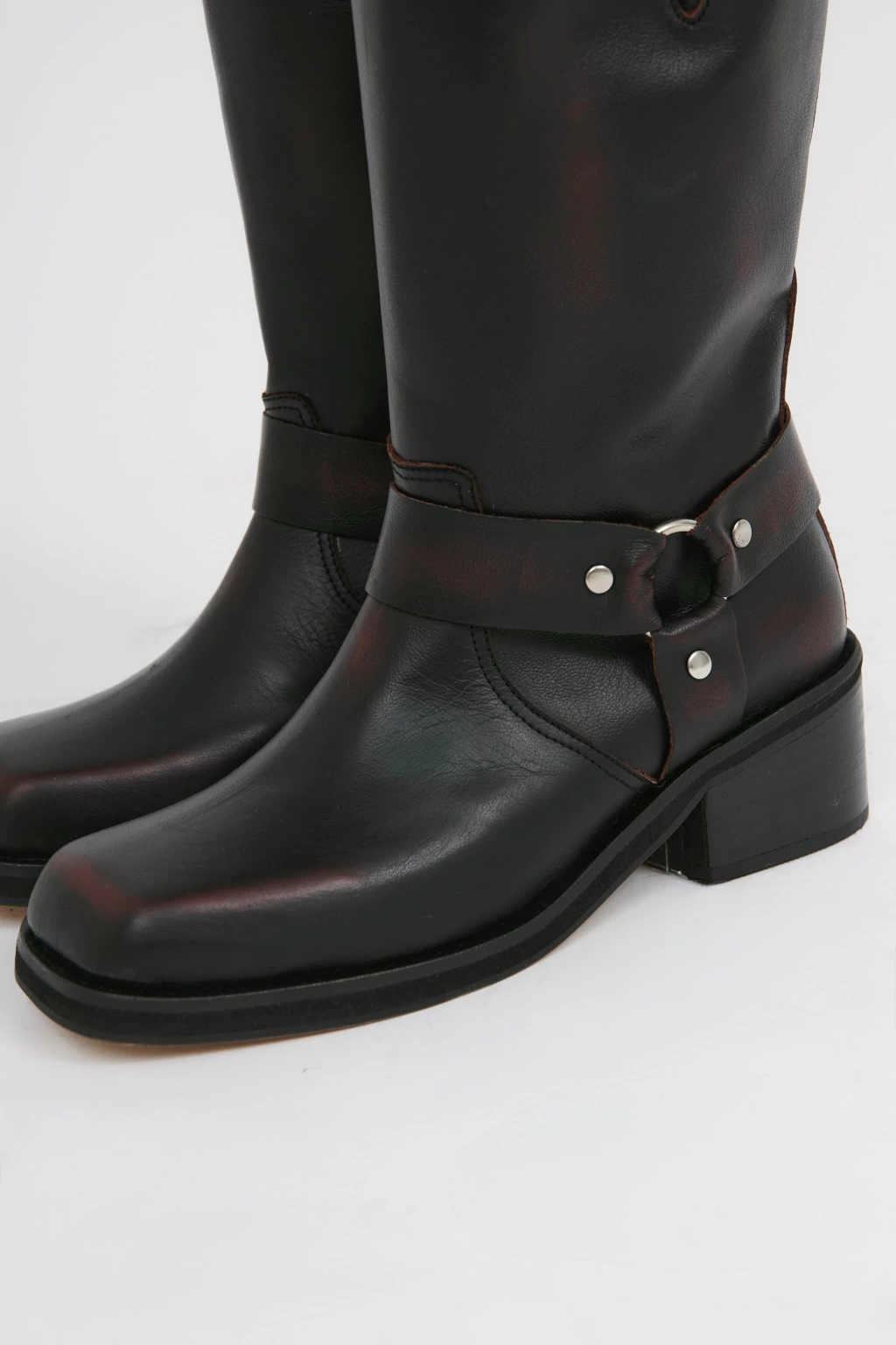 DESCRIPCION: Biker boot de cuero marrón desgastado en color bordó. Fondo terminado artesanal. Costuras a tono que complementan el diseño. Punta cuadrada. Altura de caña 27 cm. Diámetro 38 cm. Taco de 5 cm de altura.